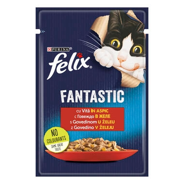 Felix Fantastic este o gama de retete delicioase preparate special cu bucati carnoase fragede intr-un aspic suculent, care arata si miros atat de bine a carne incat arata ca o hrana pe care ai gatit-o tu insuti. Hrana completa pentru pisici adulte.