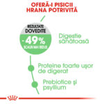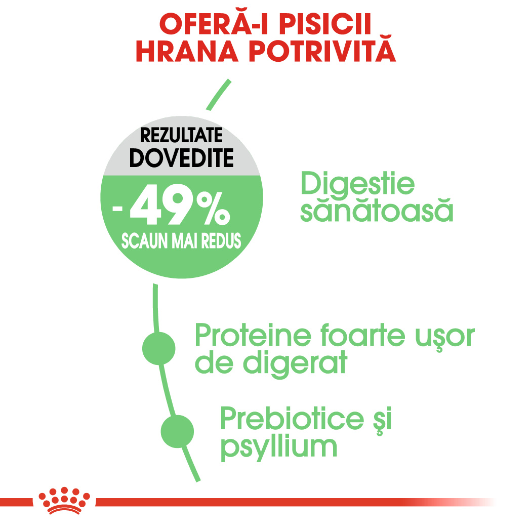 Formula Digestive Care are rezultate demonstrate: în urma administrării exclusive timp de 10 zile, s-a observat o reducere semnificativă a volumului fecalelor, ca urmare a unei digestii îmbunătățite și a absorbției mai eficiente a nutrienților (studiu intern Royal Canin).