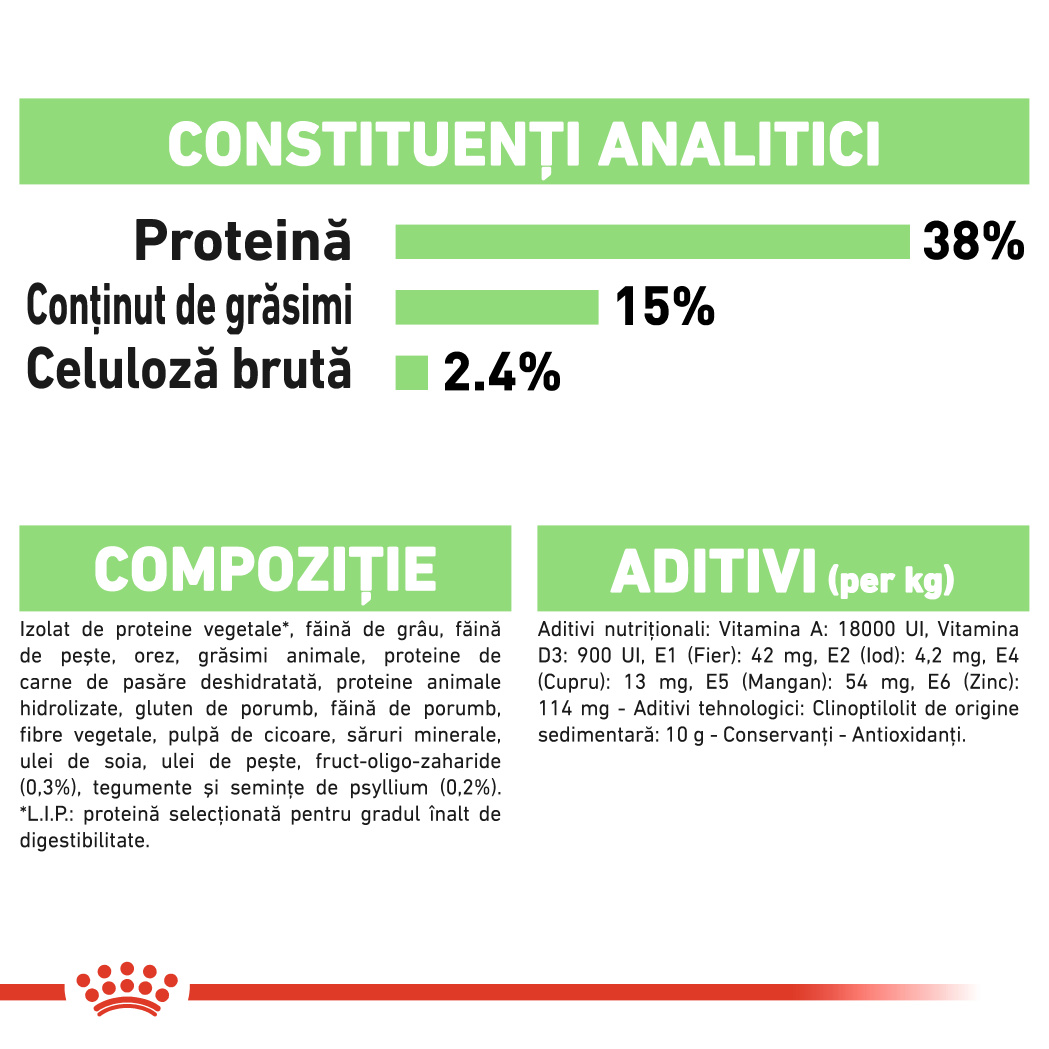 Royal Canin Digestive Care este o hrană uscată completă și echilibrată, special concepută pentru pisicile adulte cu sensibilitate digestivă, cu vârsta cuprinsă între 1 și 7 ani. Formula este adaptată pentru a susține funcționarea optimă a tractului digestiv și pentru a contribui la îmbunătățirea calității digestiei zilnice.