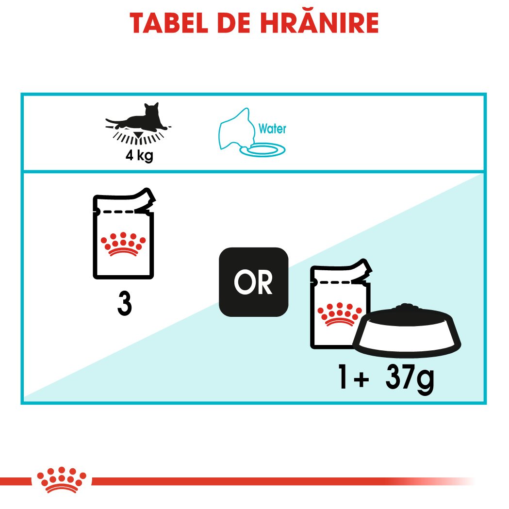| GREUTATEA PISICII | Hrănire exclusiv cu hrană umedă (plicuri/ zi) | Hrănire mixtă (hrană umedă + crochete*) |