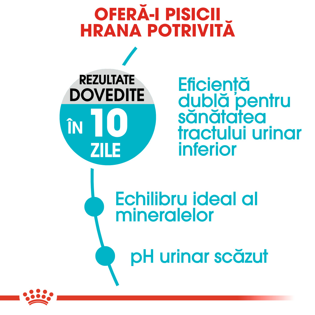 - De 2x mai multă eficacitate în îngrijirea tractului urinar inferior, după 10 zile de hrănire exclusivă cu produsul Urinary Care. * Studii interne Royal Canin. Studiu comparativ cu o rețetă de întreținere, dovedită eficientă în urolitiaza cu struviți la pisici.