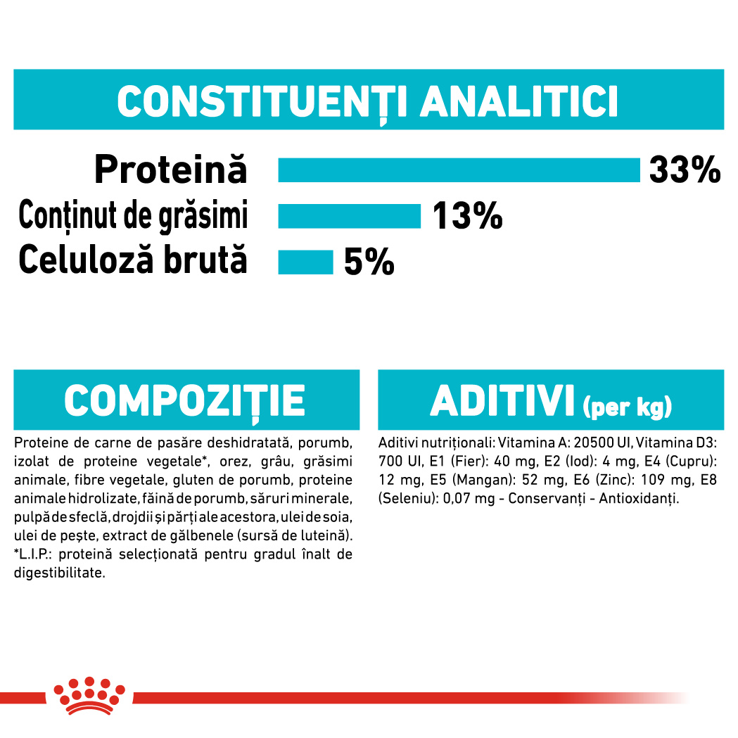 CONSTITUENŢI ANALITICI: Proteine: 33%- Grăsimi: 13%- Cenuşă: 6,6%- Celuloză brută: 5%.