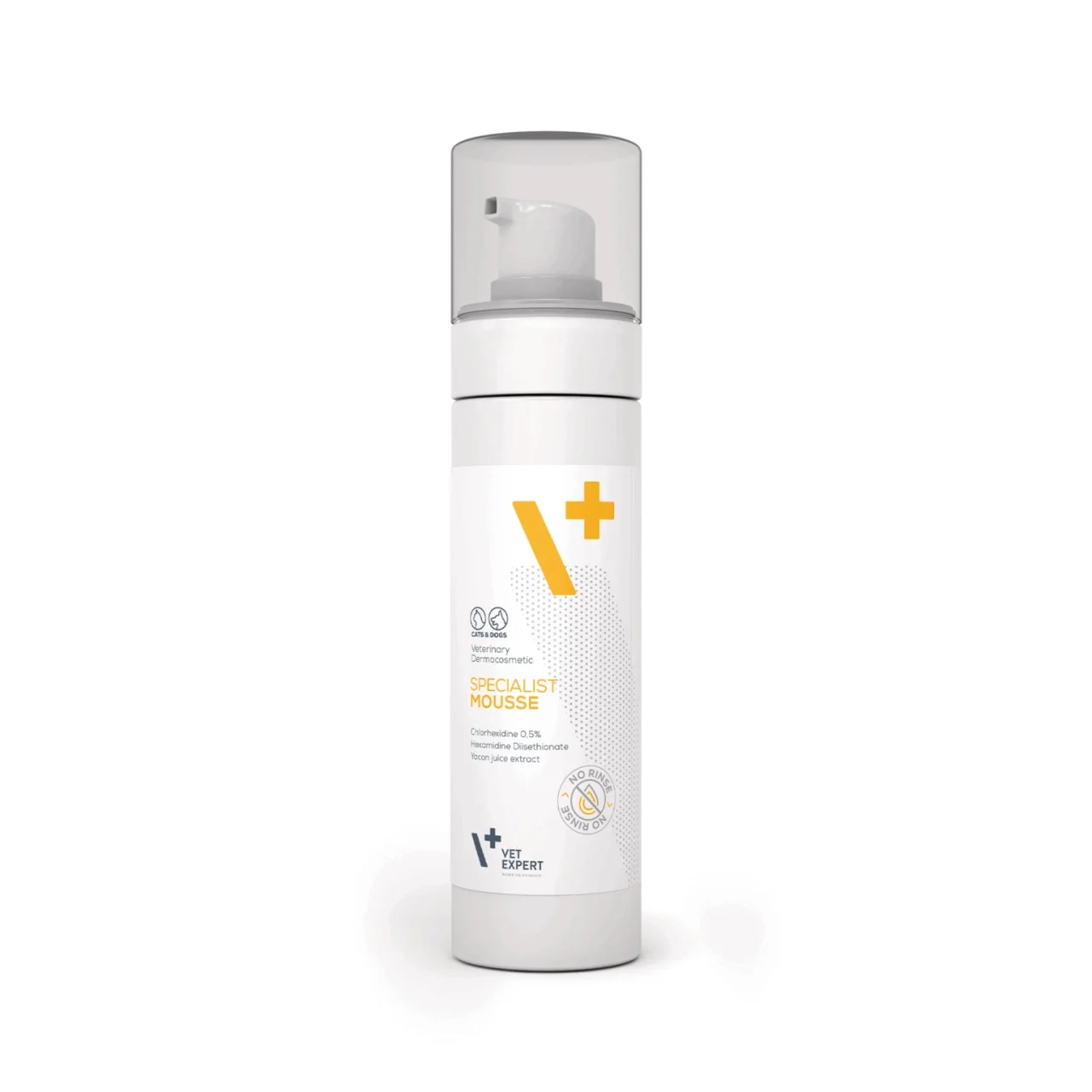 SPECIALIST MOUSSE este un șampon dermocosmetic cu o formulă fără parfum, recomandat pentru utilizare ca complement la îngrijirea SPECIALIST SHAMPOO. Are la bază clorhexidină și diisetionat de hexamidină, care ajută la menținerea microbiomului pielii, susținând în același timp crearea unui mediu care inhibă creșterea microorganismelor. Conține suc de yacon, care, datorită proprietăților sale prebiotice, susține menținerea florei benefice a pielii. Un complex de pantenol, alantoină și polizaharide care hidratează intens, calmează și întărește bariera hidrolipidică. Consistența ușoară a spumei permite o aplicare facilă pe blană și piele, curățând și îndepărtând perfect celulele moarte și alte impurități. Este potrivit pentru îngrijirea zilnică, precum și atunci când apa nu este disponibilă – după o plimbare sau în timpul călătoriilor. Spuma completează alte produse din gama SPECIALIST.