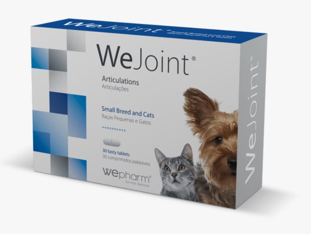 WeJoint Supliment Pentru Caini de Talie Mica si Pisici, 30 comprimate se recomanda cainilor si pisicilor cu diverse afectiuni articulare si celor care executa o suprasarcina in articulatie fie prin efort fizic excesiv, fie prin datorat procesului de dezvoltare. Totodata, WeJoint ajuta la scaderea durerii si inflamatiei, contribuie la regenerarea articulara, cat si la intarirea articulatiei.